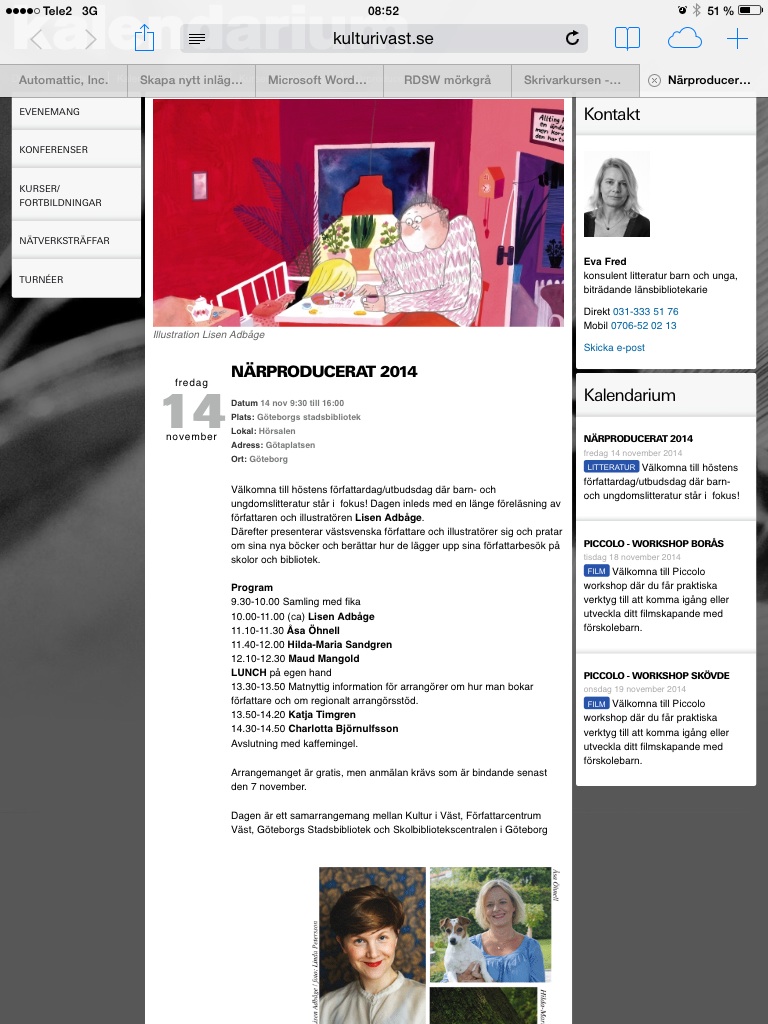 Utan telefonlinje och internetförbindelse i en vecka. Man upptäcker snabbt hur sårbar man är. I övrigt händer det mycket nu. Jag har varit ute på flera skolbesök både i Hisings Kärra och Hisings Backa och mött massor av härliga elever. Idag ska jag vara en av talarna på Närproducerat 2014. Nästa vecka blir det fler skolbesök och sedan börjar en intensiv tid med signeringar inför jul.